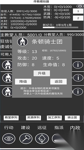 1. 大街宣传:招募20名泛信徒进入分教堂。此举措通常仅在游戏刚开场,以及组建骑士团后前往新城区传教时发挥作用(需留意,前往新城区时,可直接建造教堂,随后通过大街宣传来增加信徒数量,无需攻占该城池。当骑士团成功打下此城池后,便能够建设资源序列)。