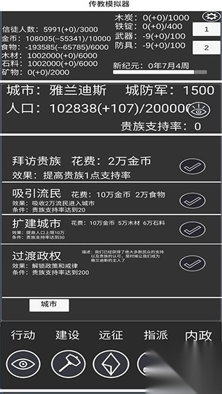 6、组建骑士团:打开远征界面,咱们稍后再聊。 7、夺取政权:即攻占此城,攻下后能够在内政板块颁布各类政策。需打下北方林、什尔郡、热砂城,方可在这三座城中建设资源建筑。(备注:即便尚未打下这三座城,也能前往传教,具体步骤为:1、修建教堂;2、在大街上进行宣传,如此便可以在新的城市招募教徒。)